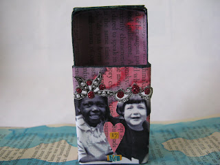 I love making art out of found objects. There is nothing so satisfying as taking something that is not worth anything and turning it into something beautiful or fun. Lately I have been making little shrines out of matchboxes. You can get a package of ten matchboxes at Wally World for less than a dollar. Add a little paper, glue and paint and make something more than the sum of its parts.